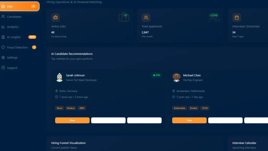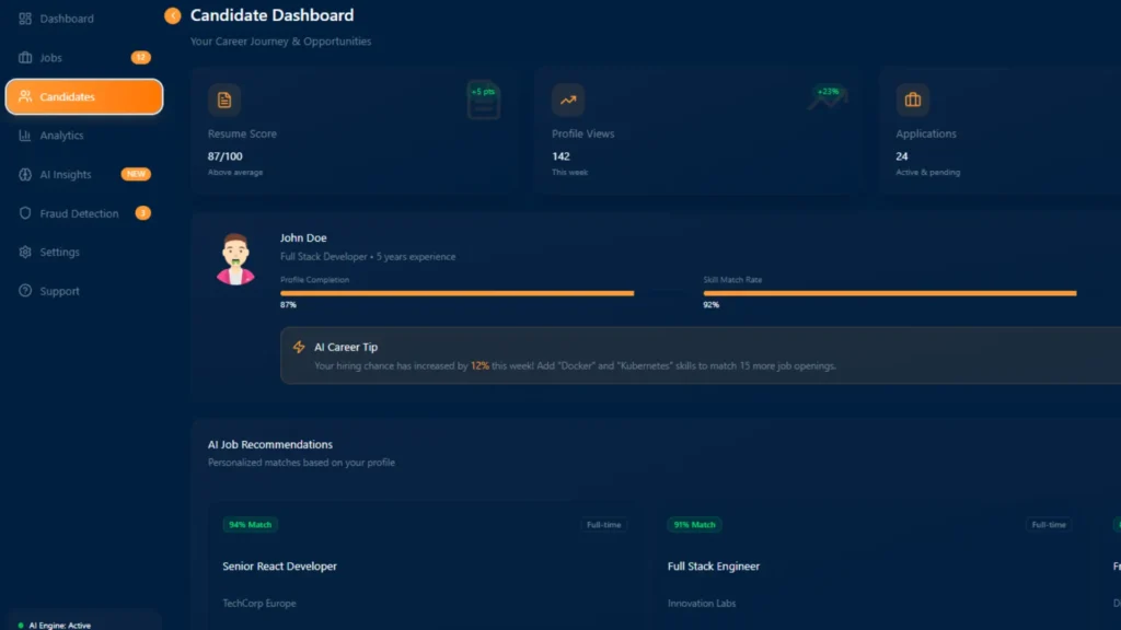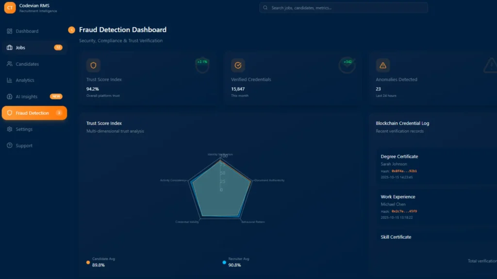 The system adheres to global recruitment compliance, secure data handling, and advanced fraud detection powered by AI-driven verification models.