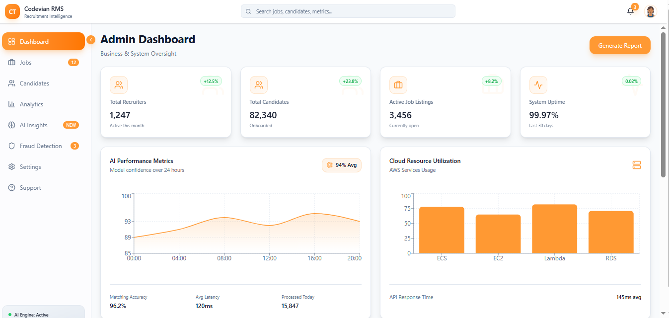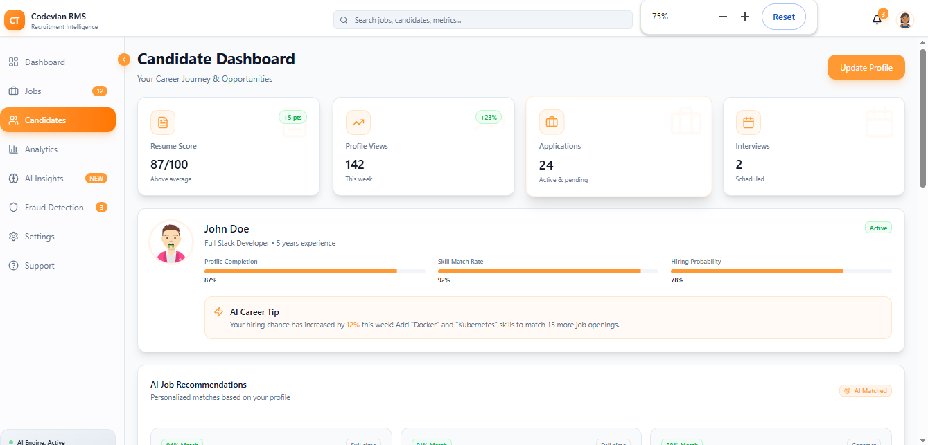 A fully-integrated dashboard enabling job postings, automated shortlisting, personalized recommendations, and interview scheduling. The dashboard brought transparency and speed to the hiring process.