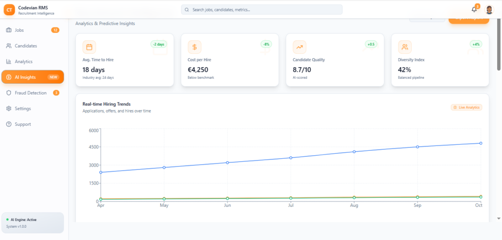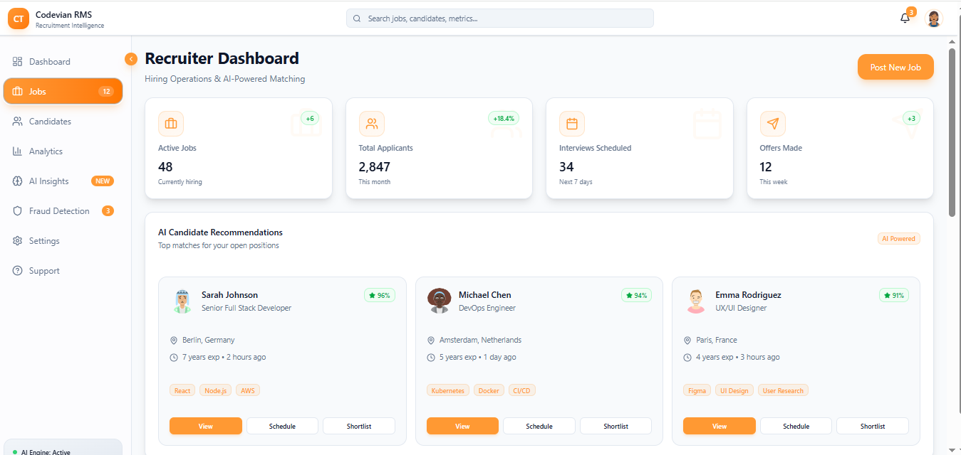 The system adheres to global recruitment compliance, secure data handling, and advanced fraud detection powered by AI-driven verification models.