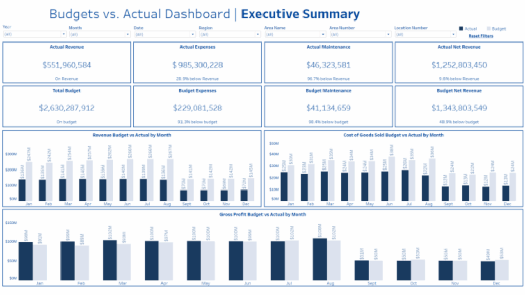The dashboard unified budget and actual data, with variance KPIs, monthly comparisons, and visual alerts on deviations. Executives can slice by region, location, and timeframe.