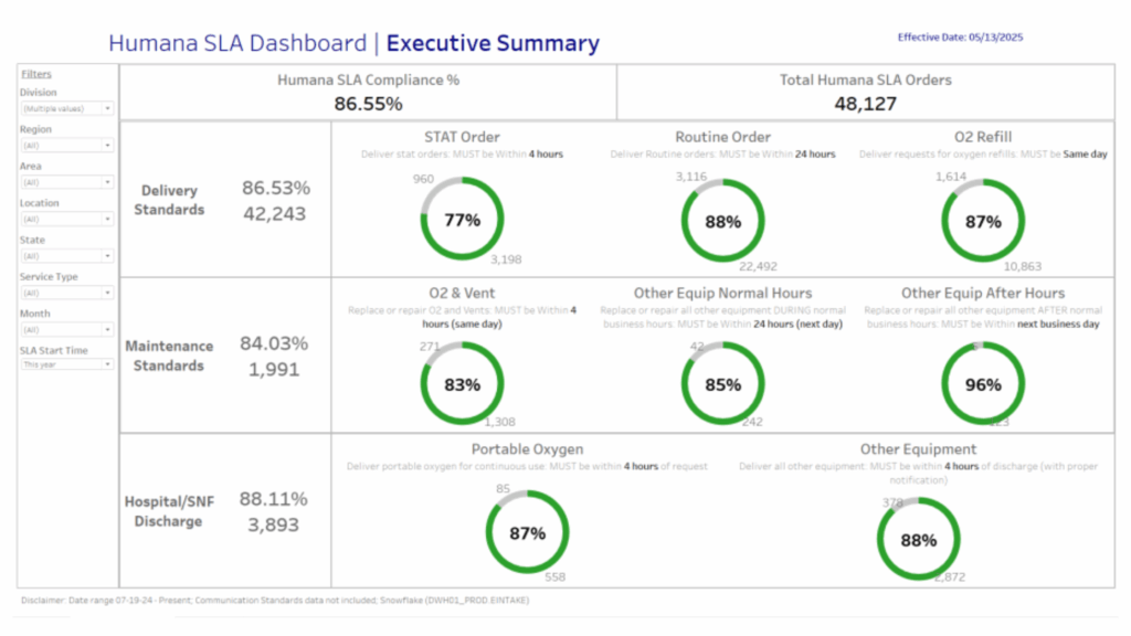 The dashboard automated SLA reporting, integrating Snowflake as a data source and Tableau for visual KPI delivery. Filters enable SLA visibility across regions, divisions, and service types.