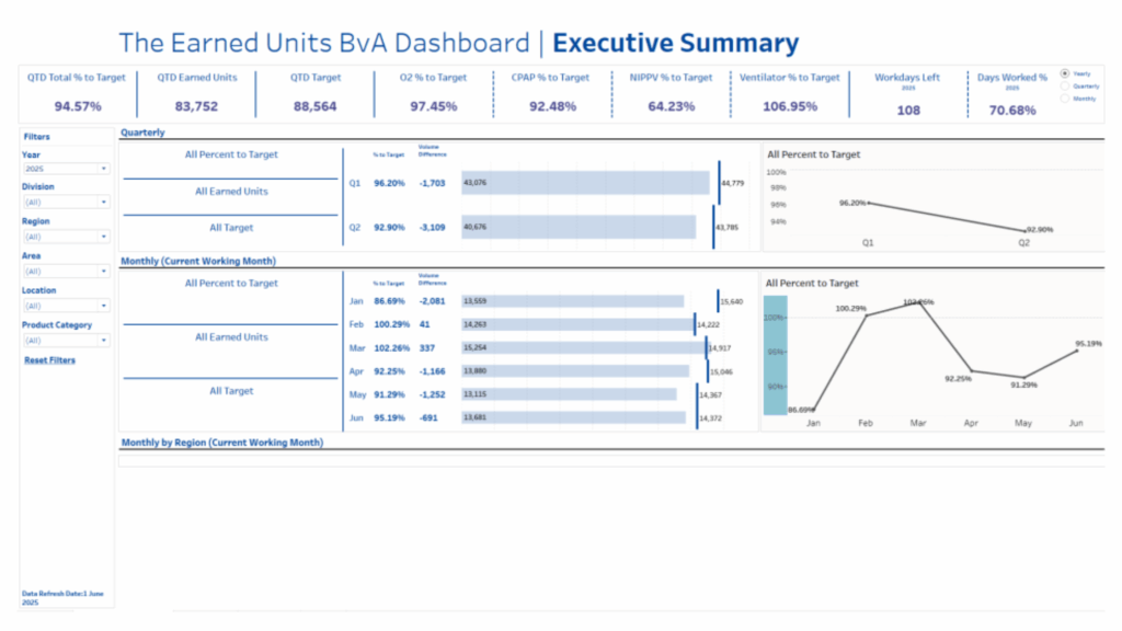 Core Value Proposition : Monitor earned medical equipment units against defined targets for business performance tracking.