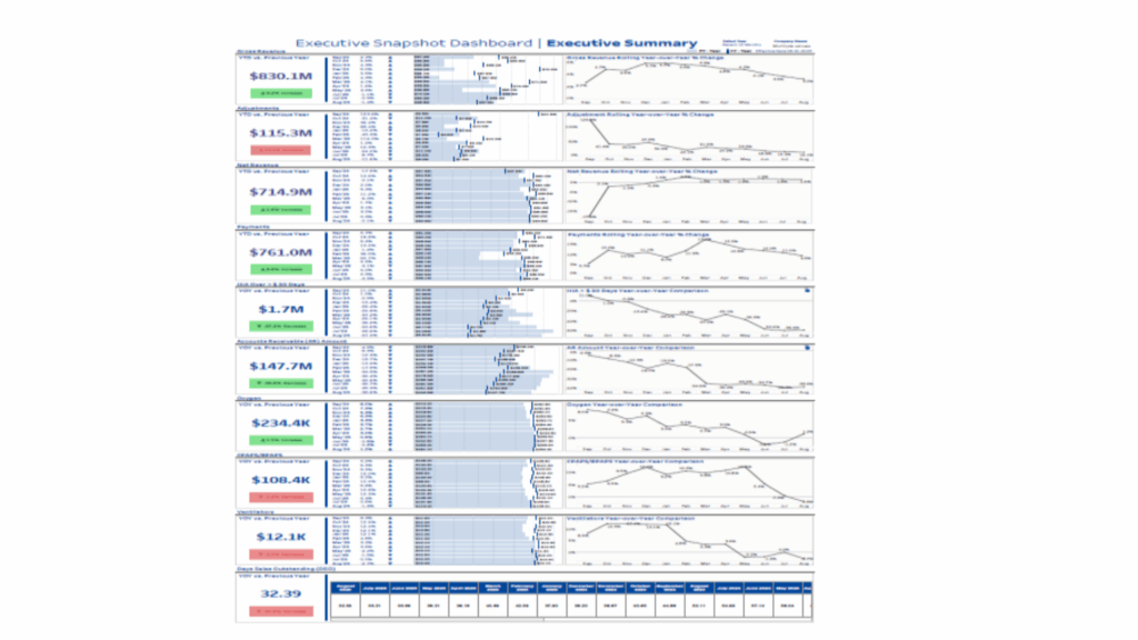 The AR Snapshot Dashboard provided a consolidated executive view, including gross revenue growth, net revenue fluctuations, and overdue account aging. It highlighted AR risk and improved oversight.